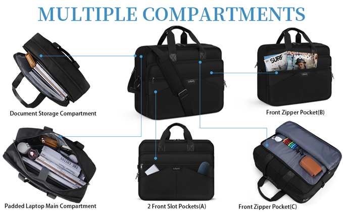 - ?【Large Capacity Laptop Bag】This laptop messenger bag is designed with multiple compartments to meet your work storage needs. Main 5 sections = 1 large compartment (included padded laptop & tablet pockets, mesh slots and still have extra room) + 1 office document storage compartment + 1 front zipper pocket(B) for magazines, books, textbooks + 1 front zipper pocket(C) include 4 slots for papper, kindle, wireless mouse, pens, passport, wallet etc. + 2 front slot pockets(A) for charger or glasses.