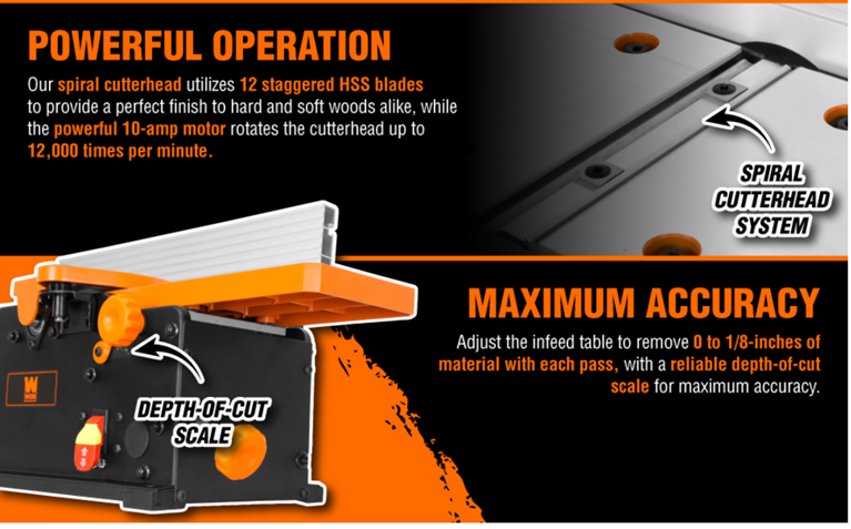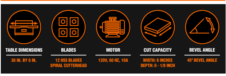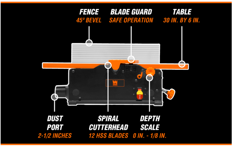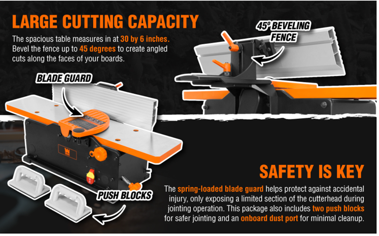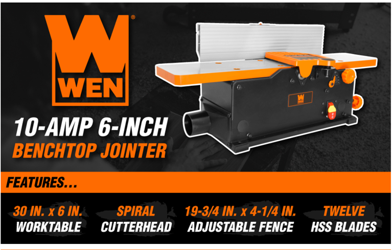 Remember when you had a perfectly square jointer to flatten out your boards and workpieces? Maximize precision with the WEN 6-Inch Benchtop Jointer. Our spiral cutterhead utilizes 12 staggered HSS blades to provide a perfect finish to hard and soft woods alike, while the powerful 10-amp motor rotates the cutterhead up to 12,000 times per minute. Adjust the infeed table to remove 0 to 1/8-inch of material with each pass, with a reliable depth-of-cut scale for maximum accuracy. The spacious table measures in at 30 by 6 inches. Bevel the fence up to 45 degrees to create angled cuts along the faces of your boards. The spring-loaded blade guard helps protect against accidental injury, only exposing a limited section of the cutterhead during jointing operation. This package also includes two push blocks for safer jointing and an onboard dust port for minimal cleanup. Compatible with the WEN BP510H Replacement Spiral Blades. And, because it's a WEN product. a stocked inventory of replacement parts, and a friendly customer help line, all to make sure you remember WEN.