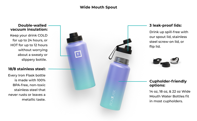 • 3 LIDS: YES, Iron Flask comes with THREE different 100% LEAK PROOF lids. Spout Lid, Flip Lid with a Handle, and a Stainless Steel Lid! *NOTE: The stainless steel lid is plastic from inside and stainless steel from outside*