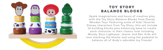 • Whether you're shopping for a kids toy as a gift, birthday present, or just because, the Disney Wooden Toys Toy Story Balance Blocks makes a wonderful surprise!