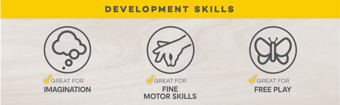 • Build out a world of fun when you introduce this classic play experience into your child’s playtime, including wooden figures, blocks, balancing blocks, cars, trains, puzzles, and clutch toys.