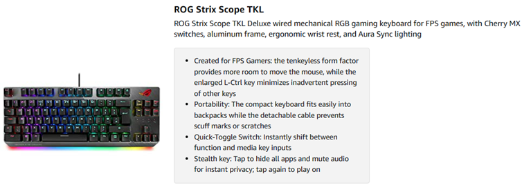 - COMPACT GAMING KEYBOARD - Designed to provide broader mouse space, ASUS ROG Strix Scope TKL Mechanical Gaming Keyboard is made of German Cherry MX Brown switches that offer enhanced gaming performance with faster, more responsive keystrokes
