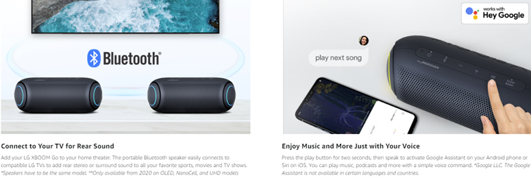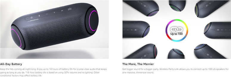 - Flashing LED lights sync to the beat of your music for a pulsing light show. Wireless Party Link allows you to connect up to 100 LG speakers for massive and immersive sound
