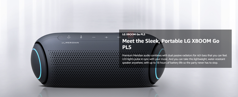 - IPX5-rated water-resistant* LG XBOOM Go is a speaker built to play in less-than-perfect conditions. Enjoy up to 18 hours of battery life for crystal-clear audio that keeps going as long as you do**