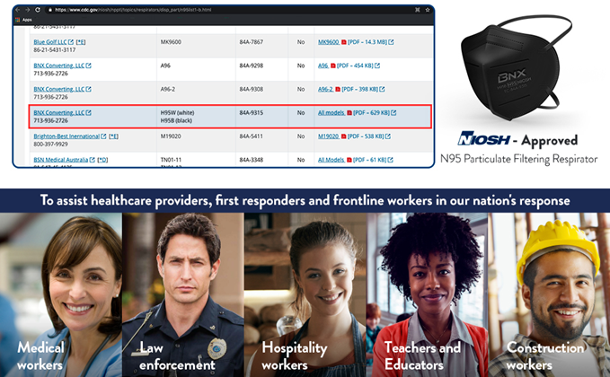 BNX Quality Promise & Applications - BNX is committed to delivering the highest quality American made safety products using the latest automated manufacturing processes and technology and the strictest quality standards. Our N95 respirator masks are ideal for use by Healthcare and Frontline workers as well in crowded or contaminated areas such as: Commercial Buildings, Construction, Food Processing & Safety, Retail, Manufacturing, Infrastructure, Education, Oil & Gas, Transportation, and more.