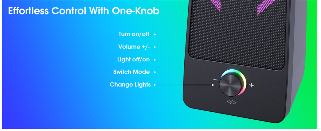- 【Effortless One-Knob Control】 Delicate one-knob design enables these stereo PC speakers to easily realize ON/OFF, switch light mode, switch mode, and volume up and down instead of complicated independent buttons.