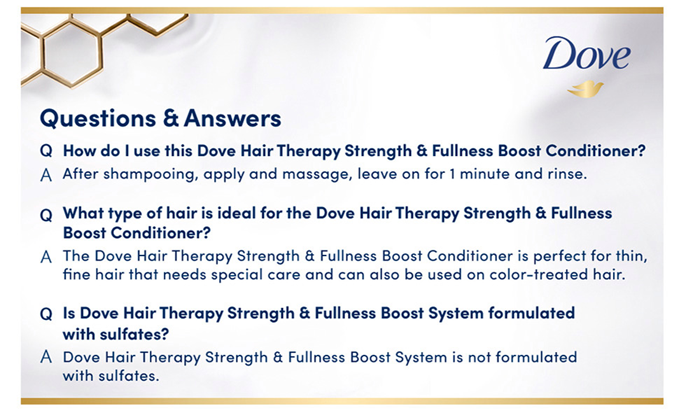 Get ready to get 2X visibly fuller, thicker hair* because Dove Hair Therapy Strength and Fullness Boost Conditioner isn’t your typical conditioner. This hair conditioner is formulated with serum and retinol for thin, fine hair that needs special care. This hair strengthening treatment strengthens and adds fullness to your hair, wash after wash. Dove Hair Therapy Strength and Fullness Boost is a sulfate free conditioner that features potent moisturizers and nourishing ingredients for care at the level of hair's cortex. So if you’re looking for soft, visibly nourished hair, look no further than this conditioner. While you hydrate hair with this hair thickening shampoo and conditioner system, let the potent moisturizers and nourishing ingredients restore your hair and add softness during your hair care routine from the first use. To refresh hair, apply after shampooing your hair with Dove Hair Therapy Strength and Fullness Boost Shampoo, and leave it on for a minute before rinsing. Unilever’s ongoing work on alternatives to animal testing for more than 30 years, and its commitment to promote their adoption globally, has been recognized by PETA, which has listed Unilever as “a company working for regulatory change.” Globally, Dove does not test on animals and is certified by PETA as Cruelty-Free. *system vs. flat hair *nourishes at the level of hair's cortex.