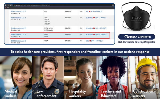 MADE IN USA – Manufactured by BNX Converting LLC in Houston TX, a NIOSH/CDC Approved and FDA Registered (Registration # 3017489417) manufacturer of N95 mask respirators.