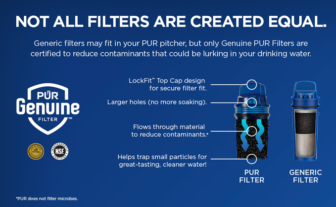 While home tap water may look clean, lead and other contaminants can get into your water through leaching lead service lines or from lead contained in household plumbing. The PUR PLUS 7 Cup Chemical and Physical Filtration Water Pitcher offers cleaner water quickly and easily, right in your fridge. This PUR PLUS water filter pitcher is WQA certified to reduce lead and other chemical and physical contaminants that could be lurking in your drinking water. PUR PLUS filter PPF951K™ is certified to reduce 3X more chemical contaminants than Brita's® leading pitcher filter.* A water filtration system is important because tap water may look clean, but can contain contaminants from pipes. Additionally, using a PUR PLUS with lead reduction filter system can reduce plastic waste and is more affordable than bottled water, helping you save up to $1,000 per year. Plus, each replacement water filter provides 40 gallons of filtered water, or 1-2 months of typical use. PUR is the #1 selling brand among certified lead reducing filters.** PUR has been developing innovative technologies for superior water filtration for over 30 years. We believe life deserves PUR water. * Versus best-selling Brita® pitcher filter OB03. Brita® is a trademark of Brita LP. **Based on Nielsen sales data for the 52 weeks ending 05/01/21.