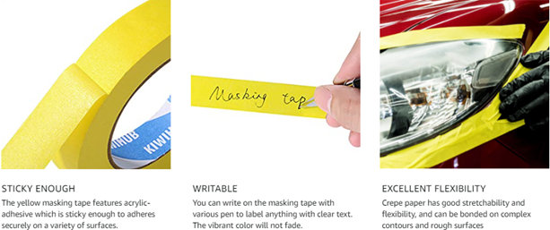 • ?Wide Application - Yellow masking tape ideal for home painting , automobile painting, watercolor painting and acrylic painting.Also can be used as labeling tape for color coding on moving boxes, storage containers, cabinets, cables, documents. Use it in home decoration, party decoration, wall art, greeting cards, scrapbooking, automotive repair and much more.