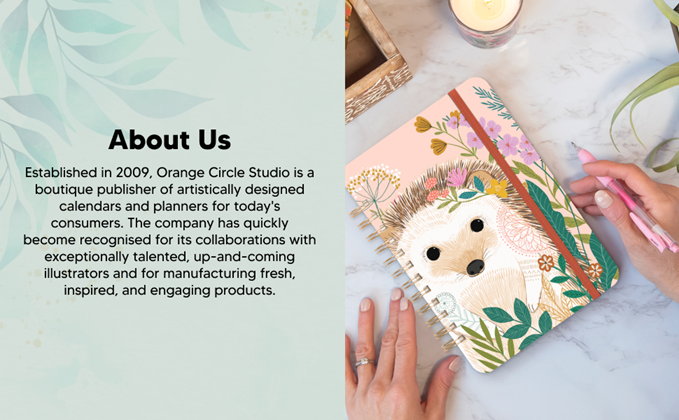 ORANGE CIRCLE STUDIO: We are a boutique publisher of sophisticated calendars, planners, and organizers created by up-and-coming artists. Each one is uniquely inspired to help motivate you and find joy in planning and tracking your schedule.