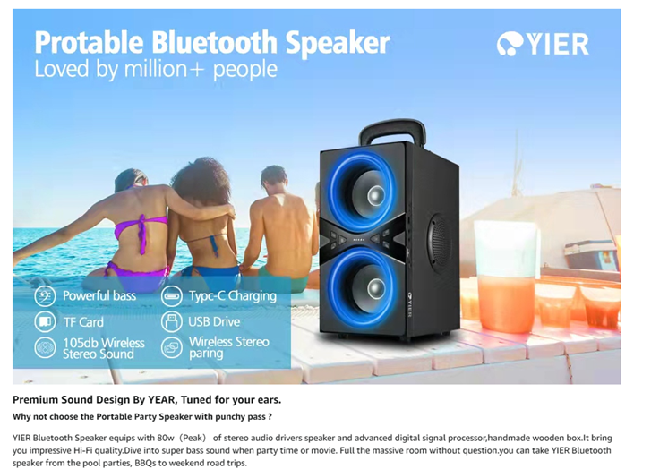 - 【Incredible Sound Loved by million people】YIER wireless bluetooth speaker has a 80w(Peak) output power and the latest 4 drivers. (2 full-range drivers and 2 tweeter driver). Meanwhile,it is debugged by professional audio engineers. So YIER wireless speakers get enhanced bass, tight mids and crystal clear highs without distortion at any volume. Its sound is loved by millions of listeners.