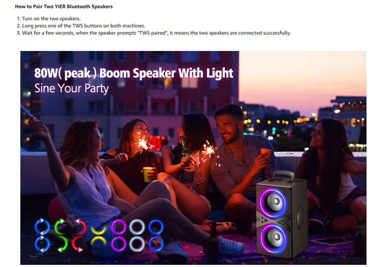 - 【Rich Punch Bass & Beats Driven Light Show】YIER party speaker is equipped with the latest bassup technology. Press this Bass button, this speaker will packs a punch and is enough to fill the whole party with music. And with the excellent rhythm light show, your party will more shine. Let's start preparing for summer vacations and parties.