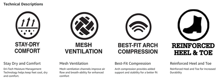 Dickies DRI-TECH comfort 6, 12 and 18 packs with wicking, moisture management fibers keeps feet dry, ventilation channels engineered for air circulation and moisture control, arch compression support hugs feet and keeps socks in place, while providing in-step support, superior fit and full cushion comforts.