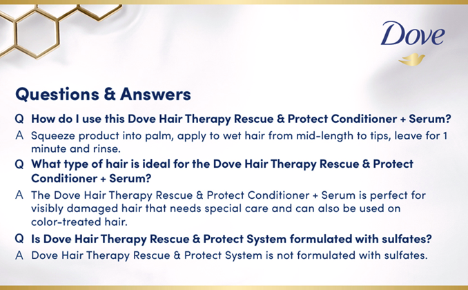 Brushing, styling, heat, pollution – your hair goes through a lot. Dove Hair Therapy Rescue & Protect Serum + Conditioner gives your hair a little extra TLC that it deserves. Formulated with ceramide and peptide, this hair care conditioner is perfect for over-processed or damaged hair that's prone to breakage and split ends. This 1 minute rinse-off conditioner combined with the potency of a serum is designed as a hair treatment to strengthen internal hair bonds, seal split ends, and protect hair from heat damage and breakage in 1 minute. For best results, pair this deep conditioner hair care treatment with our Dove Hair Therapy Rescue & Protect Shampoo. How to use: Squeeze Dove Hair Therapy Rescue And Protect Serum + Conditioner into palm, apply to wet hair from mid-length to ends, leave for 1 minute and rinse for stronger, healthier, beautiful hair! Want 2X visibly fuller and thicker hair? Try our Dove Hair Therapy Strength & Fullness Shampoo and Conditioner. For hair with that envious shine, try Dove Hair Therapy Glow & Restore Shampoo and Conditioner. Unilever’s ongoing work on alternatives to animal testing for more than 30 years, and its commitment to promote their adoption globally.