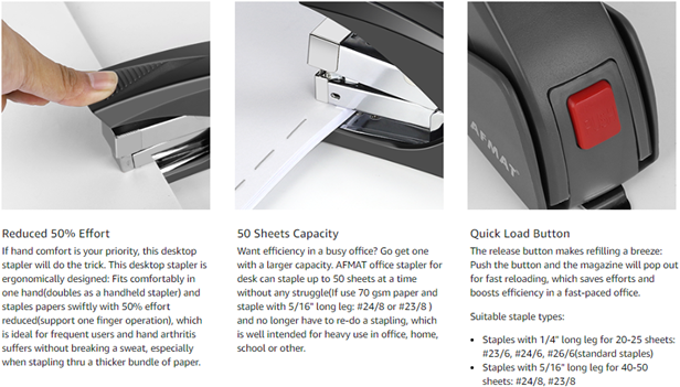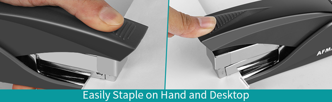 - 【50% EFFORT REDUCED Office Stapler】If hand comfort is your priority, this desktop stapler will do the trick. This desk stapler is ergonomically designed: Fits comfortably in one hand(doubles as a handheld stapler) and staples papers swiftly with 50% effort reduced(support one finger operation), which is ideal for frequent users and hand arthritis suffers without breaking a sweat, especially when stapling thru a thicker bundle of paper.