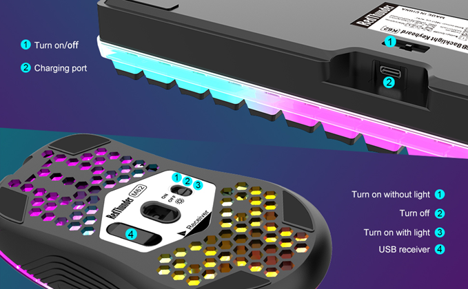 2. The keyboard and mouse share one USB receiver, which is located at the bottom of the mouse. (Only when the receiver is plugged in, the lights of the keyboard and mouse will light up)