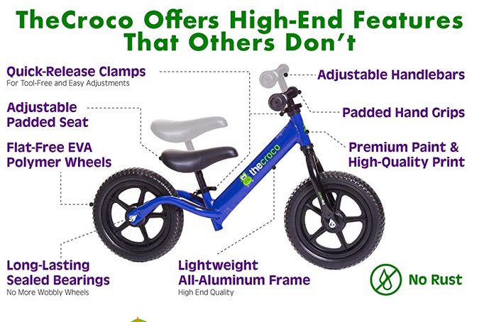 TheCroco Balance Bike allows children to focus on balancing rather than pedaling. It develops their coordination and confidence, making the transition to a pedal bike much easier. Created with ultra light and supreme quality, our bikes are designed to provide happiness that lasts for both you and your child.
