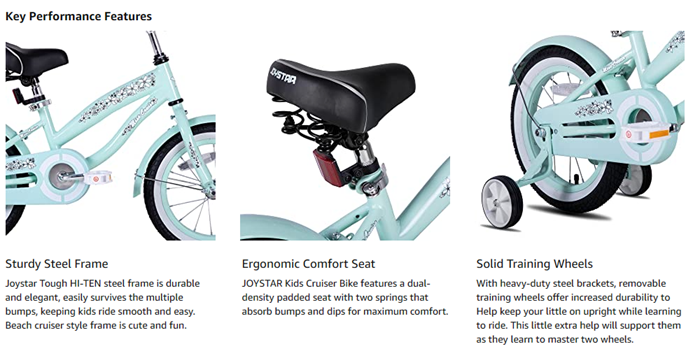 - ELEGANT SIMPLE DESIGN-JOYSTAR Kids Cruiser Bike is the perfect little kids bicycle for cruising the neighbourhood pavements and paths. With a light steel frame and rims the children can cruise up to speed with ease but rest assured that when it's time to pull up fast the combined backpedal rear brake. The kids bike is smooth and easy to pedal making it a fun cruiser for kids to ride.