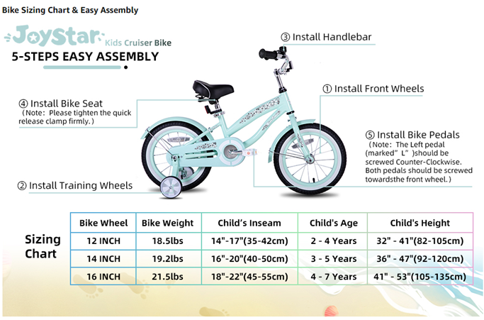 - SIZE CHART & OUR GUARANTEES-12 inch toddler bike is suitable for 2-4 years old (33-41 inch) boys & girls; 14 inch bike is suitable for 3-5 years old (35 - 47 inch); 16 inch kids bicycle is suitable for 4-7 years (41-53 inch). Adult assembly is required. The kid bike comes with 85% assembled body and the basic assembly tools, timely customer service and also limited lifetime warranty.