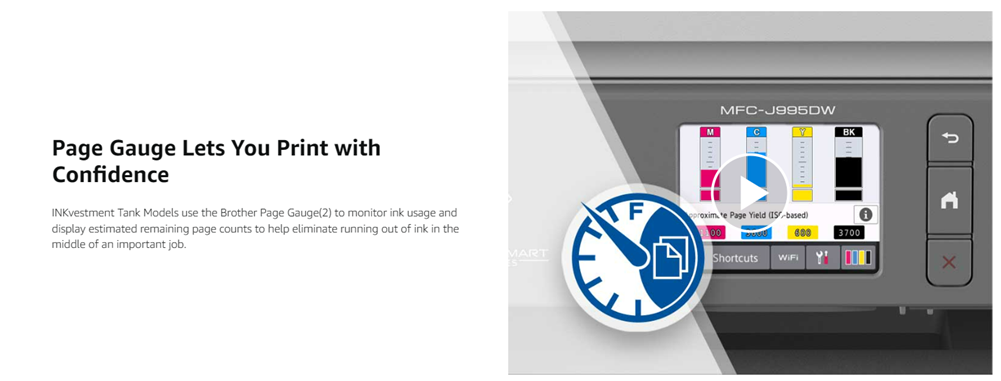 The Brother MFCJ995DW Investment Tank color inkjet all-in-one printer with tank technology is the optimal choice for your home or small office needs. It features reengineered Investment Tank cartridges along with an internal ink storage tank that delivers uninterrupted printing for up to 1-year without the need to purchase ink(1). Business-capable features include mobile device printing(3), Near Field Communication (NFC) print and scan(4), and easy onscreen navigation using the 2. 7" color touchscreen Brother Investment Tank color inkjet all-in-one printers help solve two major printing challenges -unexpectedly running out of ink and having to replace ink soon after purchasing the printer. Brother Investment Tank all-in-ones help take the guesswork out of when to replace ink by using the Brother intelligent Page Gauge(2), a visual, numerical way to know the amount of ink you've used and the amount you have remaining. No more running out of ink in the middle of an important or time-sensitive print job. Investment Tank models monitor actual ink usage and display your estimated remaining page counts to give you increased visibility, so you can print with confidence and virtually without interruption. (1)Based on average monthly print volumes of approximately 150 pages at 60% black pages / 40% color pages in accordance with ISO/IEC 24711 using 4 cartridges provided in-box. For more page yield information, see manufacturer's website. (2)Page Gauge is an estimate for informational purposes only. For actual cartridge yield information refer to manufacturer's website. (3)Requires connection to a wireless network. (4)The mobile device must have NFC capability and run Android OS 4. 4 or later. (5) Based on MSRP of LC3035 black and color ink cartridges and approximate page yield in accordance with ISO/IEC 24711. For more page yield information, see manufacturer's website. (6)Requires an Internet connection and an account with desired service. (7)Requires internet connection. (8)Reprinted from Puma with permission. Copyright 2017 Ziff Davis, All Rights Reserved. (9)Based on average monthly print volumes of approximately 300 pages (70% black pages / 30% color pages) and approximate page yield in accordance with ISO/IEC 24711 using 12 cartridges provided. (9) Based on average monthly print volumes of approximately 300 pages (70% black pages / 30% color pages) and approximate page yield in accordance with ISO/IEC 24711 using 12 cartridges provided. (10)Based on average monthly print volumes of approximately 300 pages at 60% black pages / 40% color pages in accordance with ISO/IEC 24711 using 4 cartridges provided in-box. For more page yield information, see manufacturer's website. (11) Based on ISO/IEC 24734 (after first set of ISO test pages). For inkjet print speed methodology, please visit manufacturer’s website. (12) Approximate page yields in accordance with ISO/IEC 24711. Operating Temperature: 50-95° F.