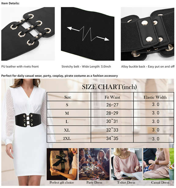 • The elastic cinch waistband is made from strong elastic. It's allowing the belt to stretch comfortably around your waist. Classic vintage design leather rivets connect corset belt, high-quality PU leather belt with well elastic wide band