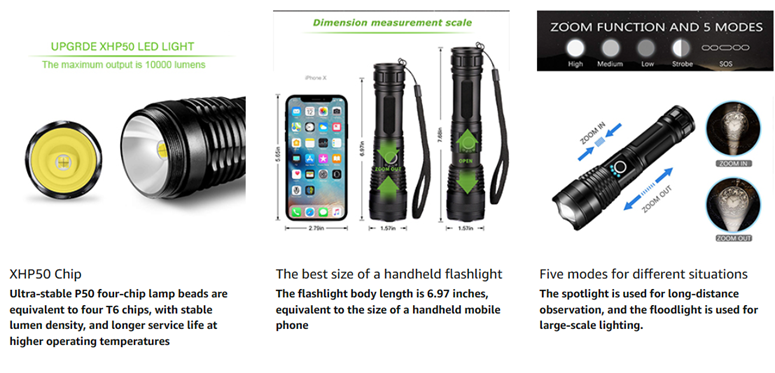 Specific Uses | ● Long Range, ● Adjustable Light Modes, ● High Power, ● Adjustable Focus, ● Rechargeable, ● Impact Resistant |