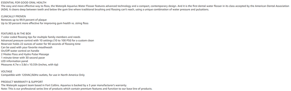 KEY FEATURES: 7 tips for multiple family members and needs, 10 pressure settings (10-100 PSI), removable 22 oz reservoir (top-rack dishwasher safe for easy cleaning), 90 secs of flossing time, 360 tip rotation, 120VAC/60Hz for use in North America only.