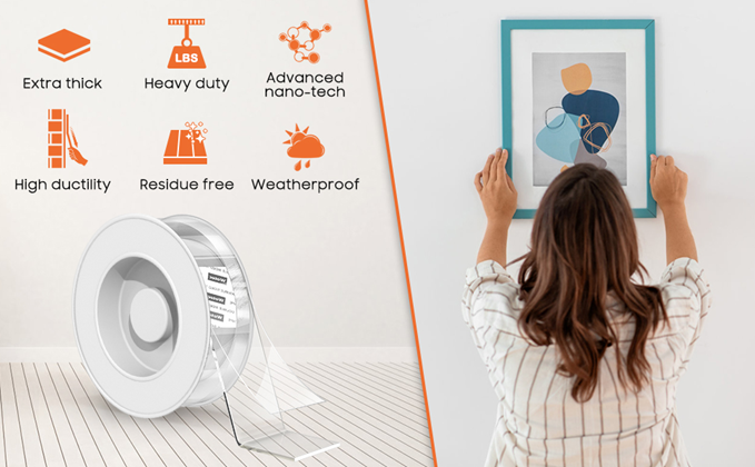Made of premium acrylic gel via advanced nano-tech, our industrial strength tape bonds instantly and could hold item permanently. Our tape will also leave no residue after removal.