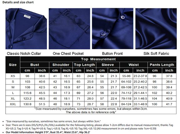 • ❤ Classic Design --- Womens satin pajama set featuring classic sleepwear style:long sleeve button down shirt and long lounge pants.The ergonomic H-shaped loose design give you the ultimate comfort. Button front design make it easy to get on and off. And the notch collar top hits at hips.Pants with soft elastic waist, makes you feel relaxed and comfortable.The chest pocket allows you to store some small stuff.This satin pajamas are lightweight and cozy for nightsleep.