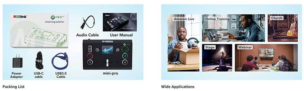 • RGBlink mini-pro is a video signal switcher and mixer which is able to stream 6-picture PVW or PGM from any one out of the 4 high quality 4K video HDMI inputs to any live broadcasting platform via third party live streaming software such as OBS. Mini-pro live stream switcher makes real time live broadcast more professional.