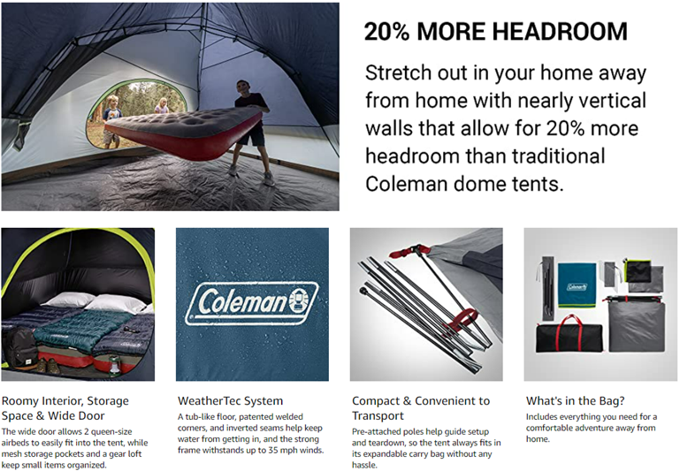 • MORE HEADROOM: 20% more headroom than traditional Coleman dome tents thanks to nearly vertical walls