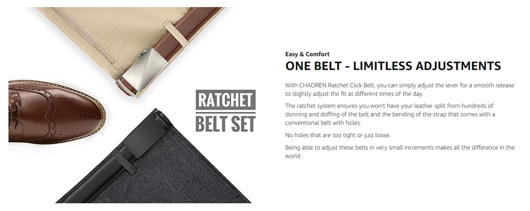 - FOR EXACT FIT - Rachette belt allows for up to 1/5" adjustments for perfect fit everywhere. The click belt features an easily removable buckle that allows you to cut the dress belt to your ideal size.