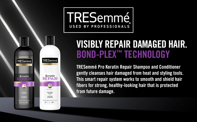 TRESemmé Pro Keratin Repair Shampoo visibly repairs hair from styling and heat damage with smart Bond Plex technology. This smart system works to smooth and shield hair fibers from within for strong, healthy-looking hair that is protected from future damage. Styling, heat, combing and washing can damage hair and break essential hair bonds, resulting in dull and unmanageable hair. Our smart technology penetrates the hair to construct new bonds and strengthen hair from within. To use, apply a generous amount of the shampoo to wet hair. Massage gently from roots to end to work into a lather. Rinse thoroughly. Follow with TRESemmé Pro Keratin Repair conditioner.