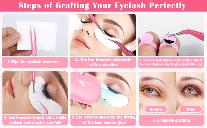 • 【Eyelash Extension Kit for Beginners & Professional 】Lash extension supplies kit includes 1 pc of hand-held USB mini air conditioning fan with a lanyard and data cable, 1 pack D Curl 0.07mm eyelash clusters mixed 8-15mm length, 10 pcs eye gel pads, 1 pc straight eyelash tweezer, and 1pc curved eyelash extension tweezer, 2 pcs lash extension tapes, 50 pcs glue ring holders, 50 pcs micro mascara brushes, 100 pcs lash mascara brushes spoolies and 1box. (Warm Tips: eyelash glue is don't include)