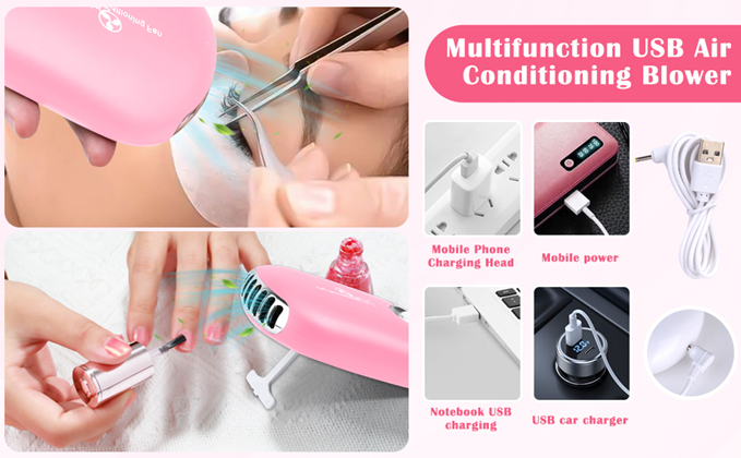 • 【USB Rechargeable Eyelash Fan Dryer】This USB lash fan dryer for eyelash extensions is designed without blades, safe enough and the built-in cooling system can blow out cold air to help the glue-grafted eyelashes dry quickly. A T-shaped bracket on the back can make it stand on the table, convenient for drying nail glue. The air conditioning fan comes with a USB charging cable you can carry it in your pocket or bag anytime and anywhere wherever travel or on business trips.