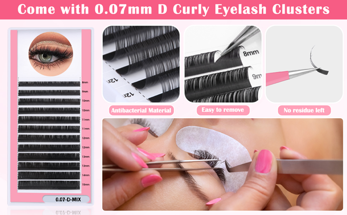 • 【DIY Individual Lash Extensions Supplies】1 Pack D Curl, 0.07mm lash clusters mixed 8-15mm Length. These individual clusters of eyelashes are made of high-quality synthetic fiber, very close to mink hair. High-quality lashes are soft, silky, and glossy. Volume lash extensions can be removed by eye makeup remover, simple to use and comfortable to wear. Lash extension clusters are perfect for professional, makeup salons, cosmetic schools, makeup artists and personal home use, etc.