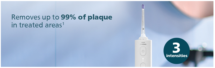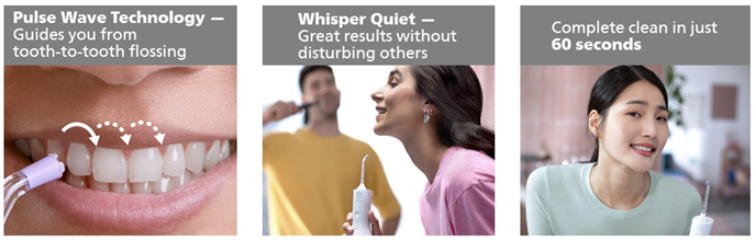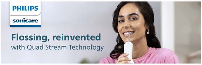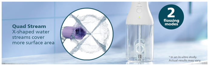 Discover effortless and convenient flossing that's 150% more effective than string floss in improving gum health! The Philips Sonicare Power Flosser 3000 Cordless has a sleek design that's easy to hold, 14-day battery life, large reservoir (no need to stop mid-clean to refill!), and is waterproof -- all for ultimate convenience. The unique Quad Stream technology creates an X-shaped stream of water that reaches deep between teeth, covering more surface area for a faster, deeper clean. Philips Sonicare Power Flosser 3000 Cordless enables you to improve your gum health by 50% in just 1 minute per day!