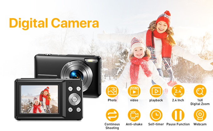 - 【FHD 1080P & 44MP DIGITAL CAMERA】: This compact digital camera for indoor/outdoor can be used for making video features with Full HD 1080P video resolution, this portable digital camera can capture 44.0MP image resolution & support 16X digital zoom, helping you capture and record the most exciting memorable moments with high-quality images or videos. This rechargeable digital camera is perfect for recording happy moments with friends, family members, and classmates indoors/outdoors.