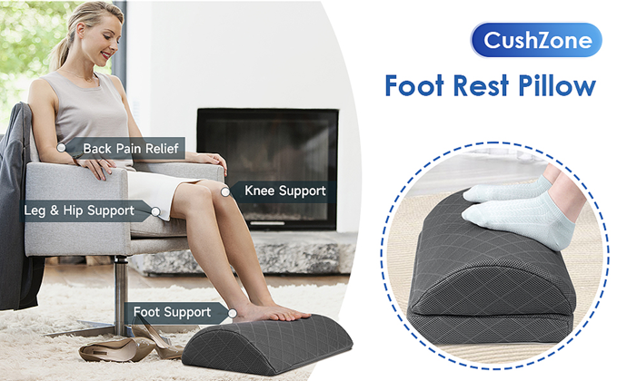- Provides A Comfortable Sitting Position: Pain relief and support for back, hip, legs, knees & feet, the CushZone footrest will reduce pressure on your lower back and hips by cushioning the bottom of your feet to help alleviate back and sciatica pain. Our footstool will also ensure proper foot placement while sitting and correct sitting posture to help improve blood circulation in the legs and relieve pain over time.