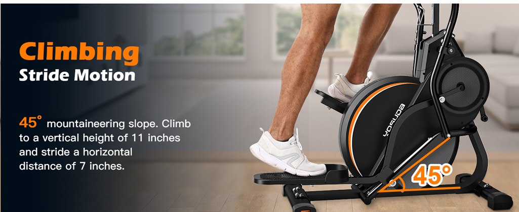• 【3-IN-1 Home Gym Equipment】YOSUDA elliptical stepper combines the easy, low-impact motion of an Elliptical, and the cardiorespiratory improving power of a Stepper, with calorie burning power of a Treadmill. Extended vertical and horizontal stride length produces a fluid climbing motion aimed to engage your whole body.
