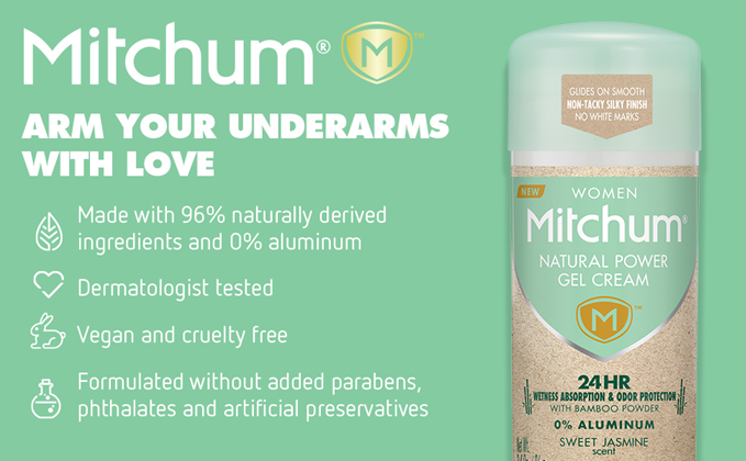 From Mitchum deodorant for women comes Mitchum Natural Power Gel Cream, an aluminum-free naturally derived odor neutralizer formulated with botanical oil extracts and powdered by bamboo power for wetness absorption. Enriched with skin-conditioning ingredients, the gentle, smooth-glide gel cream leaves skin feeling soft and moisturized—not sticky, greasy or irritated. Infused with a sweet jasmine fragrance, underarms stay dry and comfortable for 24 hours while smelling great. Formulated without added parabens, phthalates and artificial preservatives. Dermatologist tested. Vegan and cruelty free.