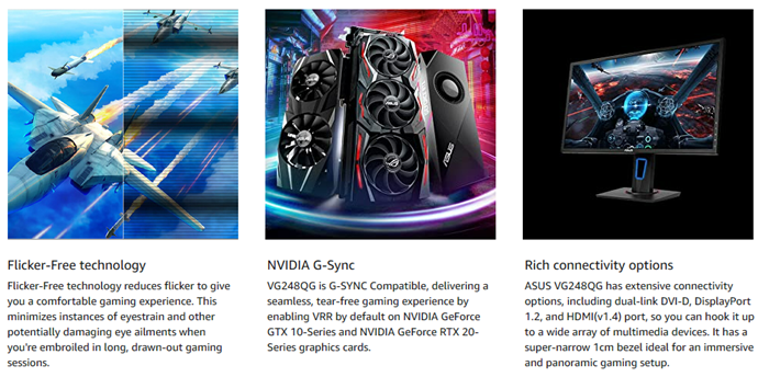 The 24” Asus VG248QG delivers a blistering Fast 165Hz refresh rate and 0.5ms response time to a full HD resolution The ergonomically-designed stand ensures ultimate viewing comfort during gaming while Asus Eye Care technology minimizes eye fatigue Asus exclusive game visual and game plus technologies enhance color performance and control. Viewing Angle (CR≧10): 170°(H)/160°(V).