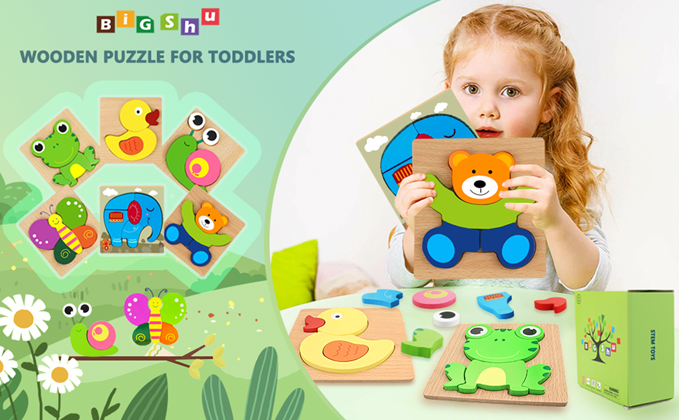 • 【SENSORY LEARNING TOYS】6PCS 3D wooden animal puzzles: duck, snail, bear, butterfly, elephant, frog. Is a sensory toys for toddlers 1-3, can develop toddler's patience, imagination, concentration, colors & shapes recognition and hand-eye coordination.
