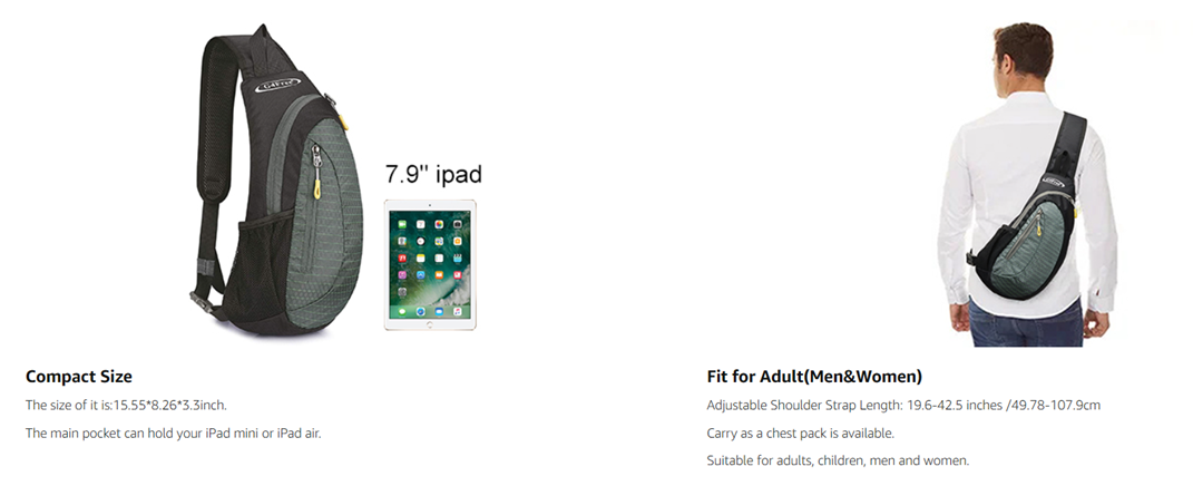 Powerful Satchel Shoulder Strap; The flexible strap of this chest bag can be adjusted varying from 19.6 to 42.5 inches in the circle. Fit for normal size or plus size. A suitable sling backpack for men, women