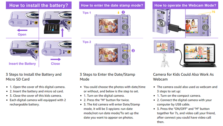 - 【Ideal Gift & 1 Year Warranty】 This portable pocket digital camera is prefect gift for your families, kids, friends, such as Children’s Day, Birthday, Christmas Gift. All our digital camera will provide 1 year Money Back Warranty and please be free to contact us if had any question, we will support 24-hours online customer service.