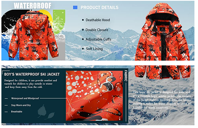 • Waterproof & Keep Dry: waterproof composite film and water-repellent coating fabric can effectively keep body dry when your kids is playing in the snow. breathability shell and moisture-absorbing down-alternative filling will keep dry after skiing