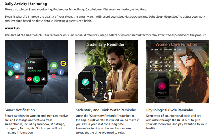 - 【Care Your Health】Smart watch can provide all-around health tracking, step tracker,calories burned,sleep quality and female menstrual cycle.(Note: The monitoring data of the smartwatch is for reference only, individual differences, usage habits or environmental factors may affect the experience of the product, if you have any questions before purchase and during use, please contact us).