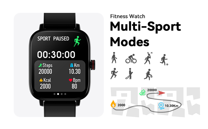 Smartwatch supports 7 sports modes, Walking, Running, Cycling, Skipping, Badminton, Basketball, Football, etc.