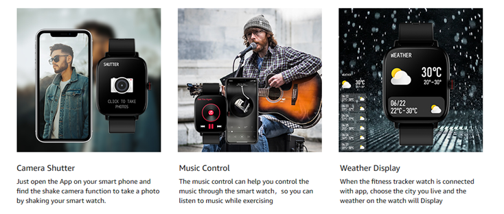 - 【7 Sport Modes & Life Assistant】It supports 7 sport modes, such as running, climbing, skipping and so on,recording your steps, distance, calories, etc activity data. Detailed record data can be viewed on the "Dafit" app It can also work as an assistant: music and camera control, weather display, sedentary reminder, drink water reminder, alarm clock, stopwatch, flashlight, find phone, which help you live a convenient life.(Note: this watch is not for swimming or soaking in water.)
